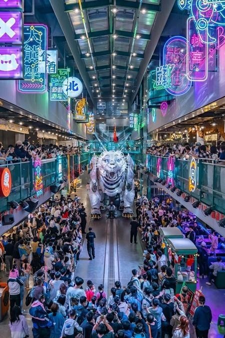 熊洞街是一個由4800平方米廢棄工業(yè)廠房改造的沉浸式IP樂園,樂園里有巨獸巡游、時尚文創(chuàng)、科技研學(xué)、特色美食等元素,用文化、科技、藝術(shù)結(jié)合的方式,打造了一個“尖叫地標(biāo)”,并通過“巨熊北北”這個超級IP,把文旅和商業(yè)業(yè)態(tài)有機融合在一起。