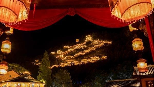 望仙谷的云海崖在夜晚亮起燈光,有如“天上宮闕”。受訪者供圖
