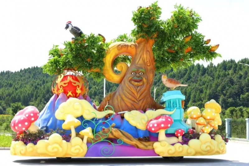 “鐘林毓秀花車”,生動(dòng)展現(xiàn)了伊春“中國(guó)林都”的綠色魅力。中央挺拔的紅松仙樹象征著伊春持續(xù)開展的植樹造林工程,樹上棲息的啄木鳥、紅隼與樹下生長(zhǎng)的藍(lán)莓、五味子,共同勾勒出生物多樣性的和諧畫卷。金祖峰日出云海的壯美景觀與八面樂舞石幢的神秘韻味,訴說著伊春生態(tài)保護(hù)的豐碩成果;ㄜ囃ㄟ^森林生態(tài)系統(tǒng)的完整呈現(xiàn),既彰顯了伊春的生態(tài)發(fā)展理念,又傳遞出植樹造林、守護(hù)生態(tài)的永恒主題,展現(xiàn)了一座城市與自然共生共榮的生態(tài)文明實(shí)踐。