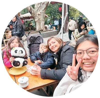 馮燕(右)與外國游客在鶴鳴茶社合影!∈茉L者供圖