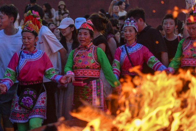 “不用懂專業(yè)舞步,跟著大家一起,怎么開心怎么跳!” 在大理州巍山縣拱辰樓廣場,躍動的篝火映紅了古老的城墻,來自西安的游客劉欣已融入當(dāng)?shù)貞c祝火把節(jié)的彝族打歌隊伍中。“打歌隊員帶領(lǐng)大家圍著篝火唱跳,簡直太開心了!”她說。