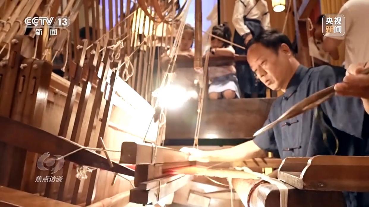 蜀錦省級(jí)非遺傳承人 曹代武:梭子從這個(gè)開口里邊過(guò)來(lái),然后我就把緯線編織到里面了,織出來(lái)就是你現(xiàn)在看到的這個(gè)唐代的五彩鳥紋樣。再來(lái)一梭,一梭一梭的,就這樣反反復(fù)復(fù)。