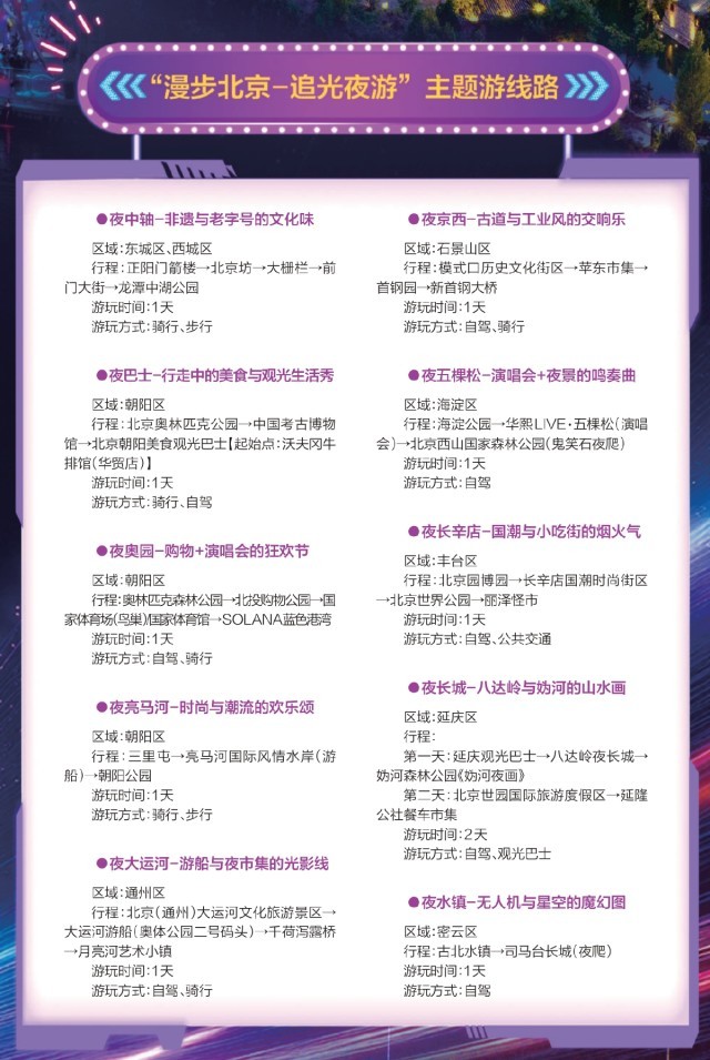 旅游線路推薦也有了夜間“專屬套餐”。繼2024年推出“月光下的北京”城市夜游指南,北京市文旅局在今年又推出10條“漫步北京-追光夜游”主題游線路,聯(lián)動(dòng)互聯(lián)網(wǎng)生活服務(wù)平臺(tái),以熱門線路為依托,打造出“可逛、可玩、可吃、可曬”的沉浸式體驗(yàn),深化文商旅融合。上萬家商戶推出專屬套餐,輻射文旅、餐飲、零售等多元場(chǎng)景,為北京夜經(jīng)濟(jì)注入強(qiáng)勁新活力。