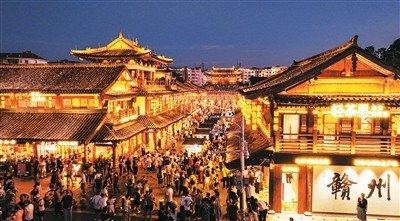 今年夏季,江西省贛州市推動(dòng)消費(fèi)場景創(chuàng)新,借助系列賽事活動(dòng)打造“票根經(jīng)濟(jì)”,吸引八方游客前來旅游觀光,帶動(dòng)消費(fèi)市場持續(xù)火熱。圖為贛州市章貢區(qū)江南宋城歷史文化街區(qū)。