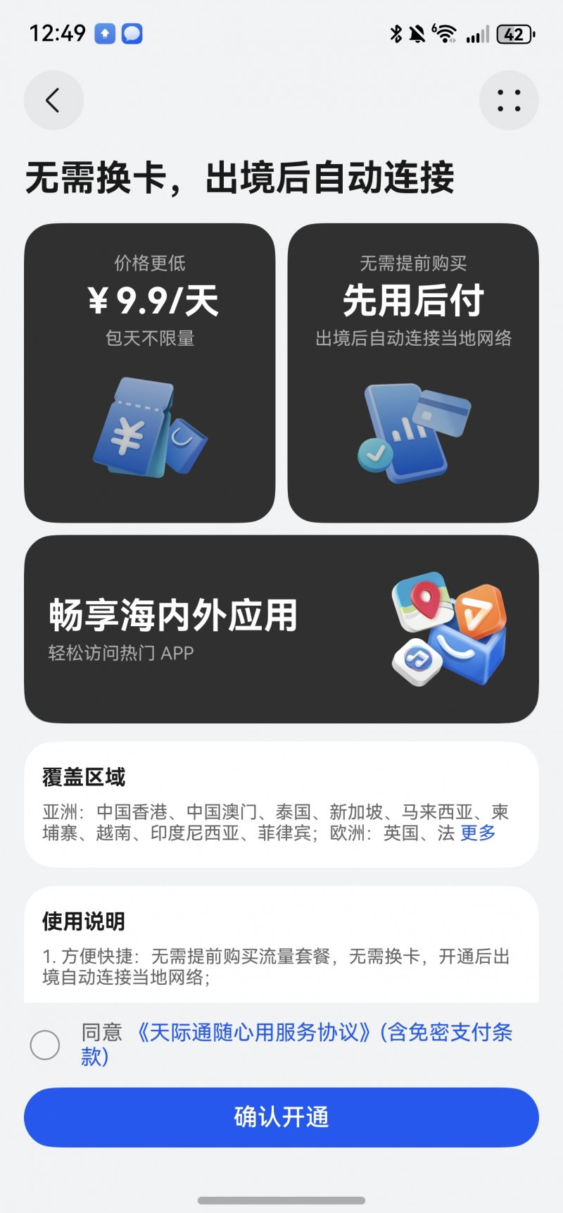緊接著,天際通第二重禮·隨心用——9.9元/天多地流量隨心用,針對(duì)多地旅行或深度游用戶,天際通推出「9.9元/天多地流量隨心用」服務(wù),用戶無(wú)需換卡,支持先用后付,按需付費(fèi)。每24小時(shí)僅需9.9元,享5GB高速流量+常速不限量,覆蓋歐美、東南亞等50個(gè)熱門地區(qū);單次開通長(zhǎng)期有效,不用不扣費(fèi),聯(lián)程轉(zhuǎn)機(jī)無(wú)縫銜接。