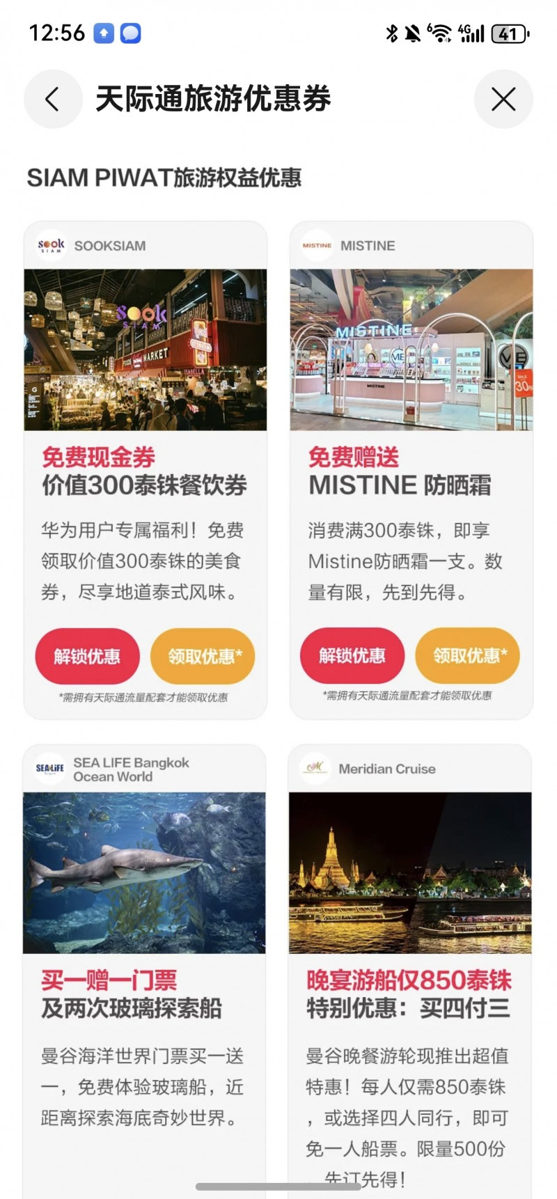 華為手機(jī)用戶開啟天際通流量后,可以在泰國(guó)、馬來(lái)西亞、越南、印尼免費(fèi)領(lǐng)取Grab游客優(yōu)惠禮包,憑Grab優(yōu)惠禮包即可享受精選服務(wù),包括機(jī)場(chǎng)接送、打車折扣、外賣餐飲、超市購(gòu)物等出游場(chǎng)景,輕松暢游東南亞。還可領(lǐng)取Klook旅游權(quán)益優(yōu)惠,無(wú)論您是在中國(guó)香港&澳門暢游看夜景,還是在日本觀賞和風(fēng)之美,在韓國(guó)感受韓風(fēng)潮流、越南邂逅燈火古鎮(zhèn),即可享受景點(diǎn)購(gòu)票全單95折優(yōu)惠。在活動(dòng)頁(yè)還可領(lǐng)取朗廷卓逸會(huì)全球酒店住宿禮遇及專屬優(yōu)惠房?jī)r(jià),共覆蓋全球超過(guò)30家知名酒店。