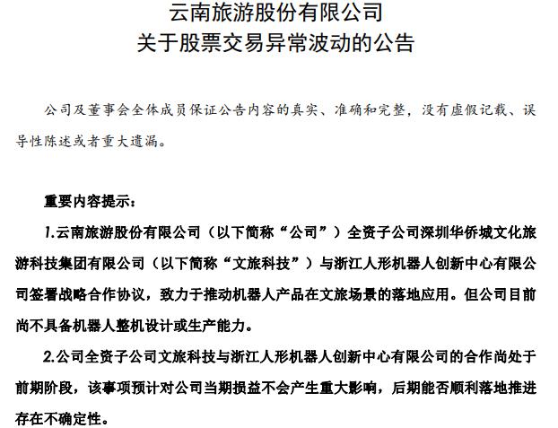 根據(jù)云南旅游22日盤后發(fā)布的異動公告,目前,雙方合作尚處于前期階段,該事項預計對公司當期損益不會產(chǎn)生重大影響,后期能否順利落地推進存在不確定性。另外,公司目前尚不具備機器人整機設計或生產(chǎn)能力。
