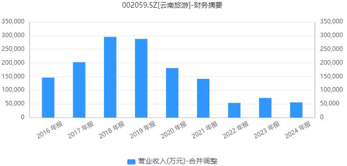 雖然擁有稀缺的旅游資源,但是在業(yè)績上,云南旅游卻沒有將優(yōu)勢轉(zhuǎn)化為利潤。營收方面,公司在2018年達到高點后就快速下滑,這幾年營收規(guī)?s水較嚴重,2024年公司的營收5.57億元,僅相當于2018年營收的18%左右。