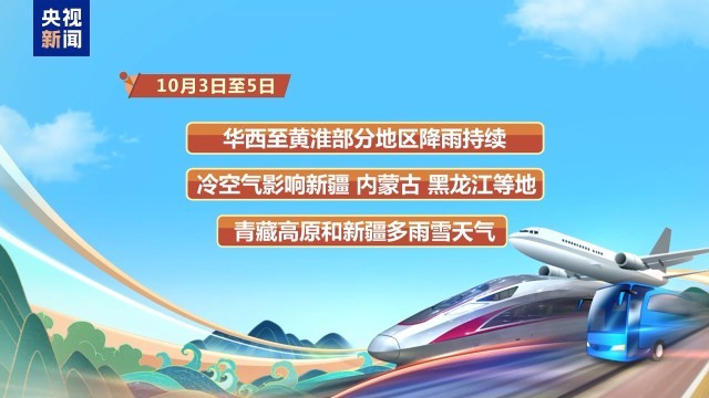 據(jù)中央氣象臺(tái)發(fā)布的消息,10月3日至5日,華西至黃淮一帶部分地區(qū)降雨持續(xù),冷空氣影響我國(guó)新疆、內(nèi)蒙古、黑龍江等地,青藏高原和新疆多雨雪天氣。公安部交通管理局提醒廣大駕駛?cè)撕统鲂腥罕,注意關(guān)注沿途及目的地氣象部門預(yù)報(bào)預(yù)警信息。