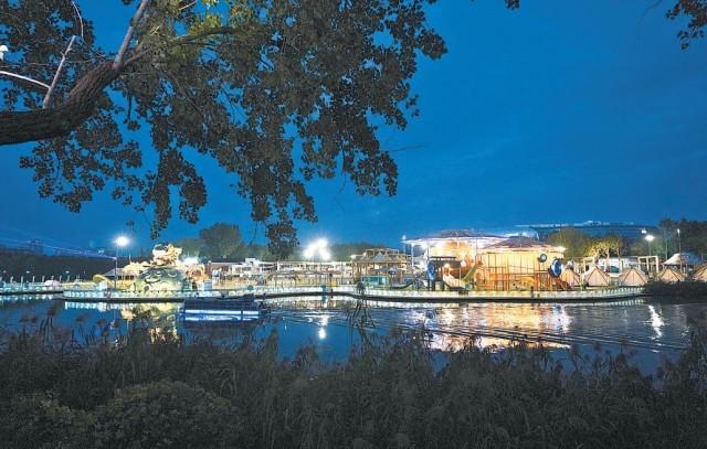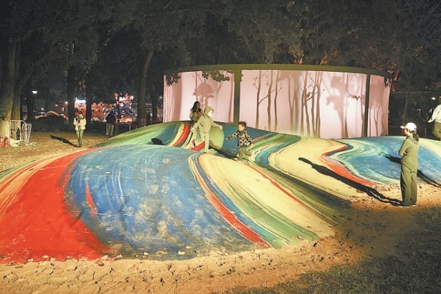 朝陽公園中心島,孩子們在燈光彩飾的沙灘上玩耍。
