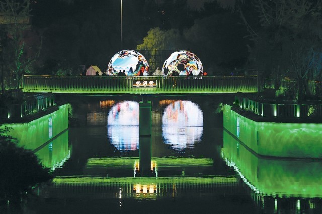 觀瀾橋上,燈光藝術(shù)裝置美輪美奐。 本報記者 程功攝