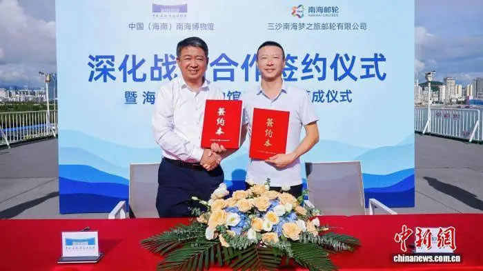 10月13日,全國首家海上流動博物館升級改造落成儀式在三亞舉行。圖為中國(海南)南海博物館與三沙南海夢之旅郵輪有限公司簽約。(三沙南海夢之旅郵輪有限公司 供圖)