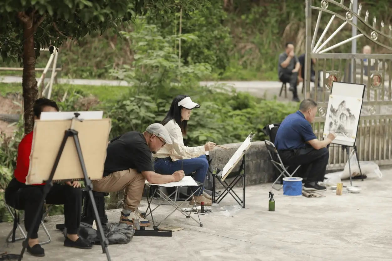 采風(fēng)途中,藝術(shù)交流的氛圍格外濃厚。名家們時而圍站在一起,探討皴擦點染的技巧;時而各自凝神,將眼中的崀山轉(zhuǎn)化為筆下生動的線條與色塊。一幅幅即興創(chuàng)作的作品,在濃淡墨色的交融間,既展現(xiàn)了丹山碧水的壯闊,又傳遞了鄉(xiāng)村振興的蓬勃生機,讓崀山之美在宣紙絹素上綻放新韻。