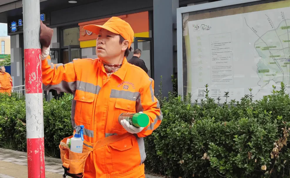 在槐蔭區(qū),環(huán)衛(wèi)工人馬增霞隨身攜帶“八寶袋”,對(duì)齊州路沿線的垃圾桶、路燈桿、公交站牌等進(jìn)行清掃。“這個(gè)‘八寶袋’里有軟毛刷、硬毛刷、除膠劑、手套、噴壺等8種工具。”馬增霞介紹,“八寶袋”輕便易攜且取用便捷,可實(shí)現(xiàn)“一包在手,百污可除”,有效提升了主次干道人行道、交通出入口等重點(diǎn)區(qū)域的動(dòng)態(tài)巡查處置效率;夾層內(nèi)的清涼油、創(chuàng)可貼、速效救心丸,既為保潔人員提供安全防護(hù),也能滿足市民應(yīng)急需求。