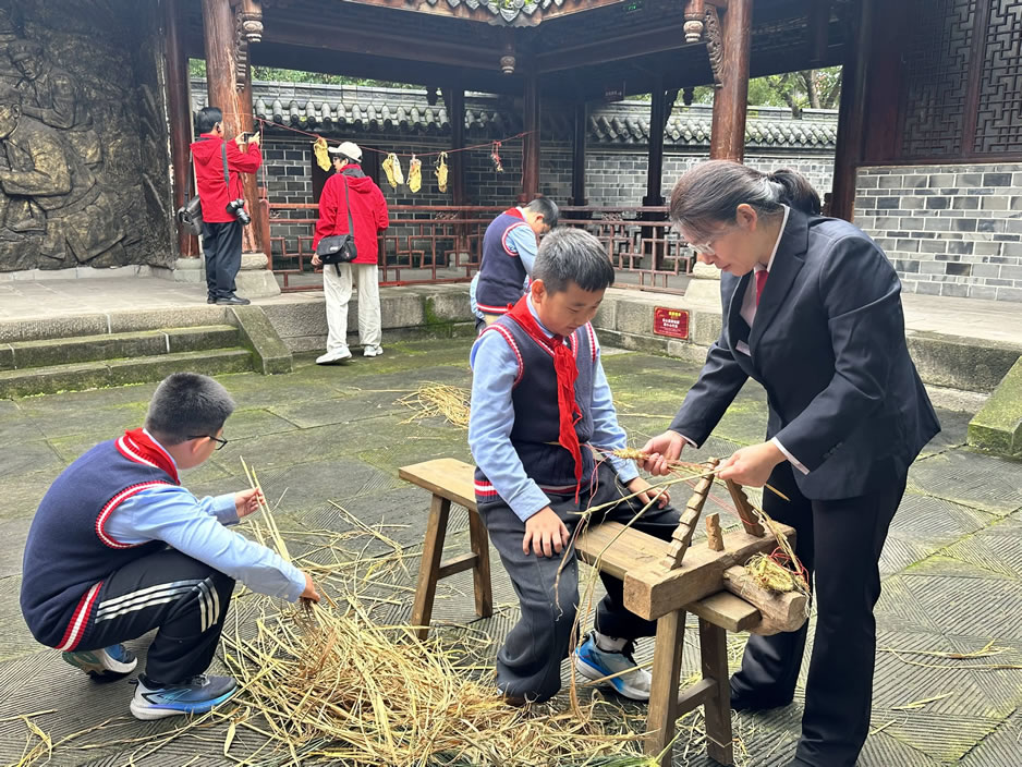 劉瑞龍紅軍小學(xué)的學(xué)生正在體驗(yàn)編織紅軍草鞋的過程。新華社記者趙一帆 攝