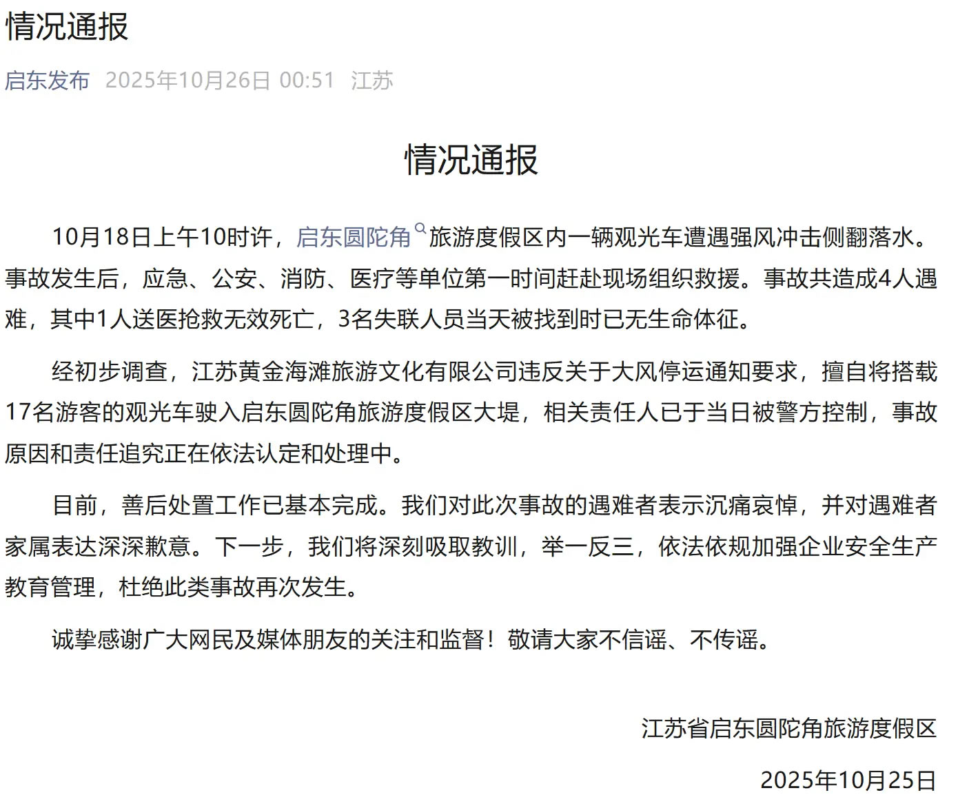 該通報(bào)稱,10月18日上午10時(shí)許,啟東圓陀角旅游度假區(qū)內(nèi)一輛觀光車遭遇強(qiáng)風(fēng)沖擊側(cè)翻落水。事故發(fā)生后,應(yīng)急、公安、消防、醫(yī)療等單位第一時(shí)間趕赴現(xiàn)場(chǎng)組織救援。事故共造成4人遇難,其中1人送醫(yī)搶救無(wú)效死亡,3名失聯(lián)人員當(dāng)天被找到時(shí)已無(wú)生命體征。