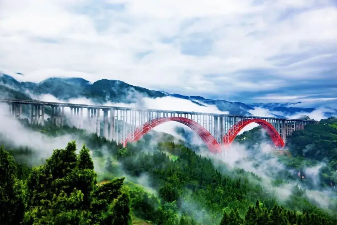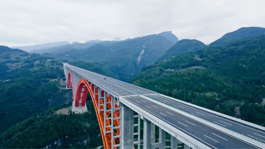 山澗云興霞蔚,雙虹飛跨天險(xiǎn)。橙紅拱如晨曦暈染,勾勒群山力量曲線;簡(jiǎn)潔的四肢鋼管,書寫出結(jié)構(gòu)美學(xué)的動(dòng)人詩篇。索道飛越,是工程與自然的和諧共舞;樁基深植,是技術(shù)與地質(zhì)的真誠對(duì)話。雙堡特大橋連接山與山,更連接人與自然。