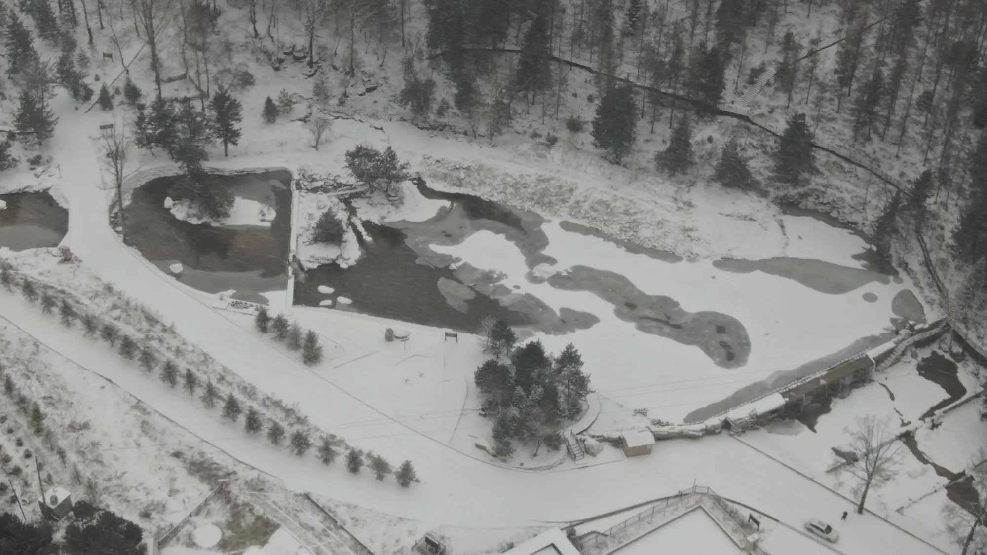 溪流與瀑布是雪中最靈動的景致。十里清溪在皚皚白雪間蜿蜒,水面蒸騰的薄霧與雪氣交融,讓溪流似隱似現(xiàn),宛如銀綢纏繞山間。小型瀑布部分凝結(jié)成冰,晶瑩的冰掛與流動的溪水相映成趣,水珠滴落時濺起的水花沾在石上,瞬間凝成冰晶,構(gòu)成動靜結(jié)合的畫面。溪邊的苔石被積雪覆蓋,只露出邊緣的青黑,與白雪形成強烈對比。