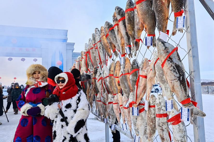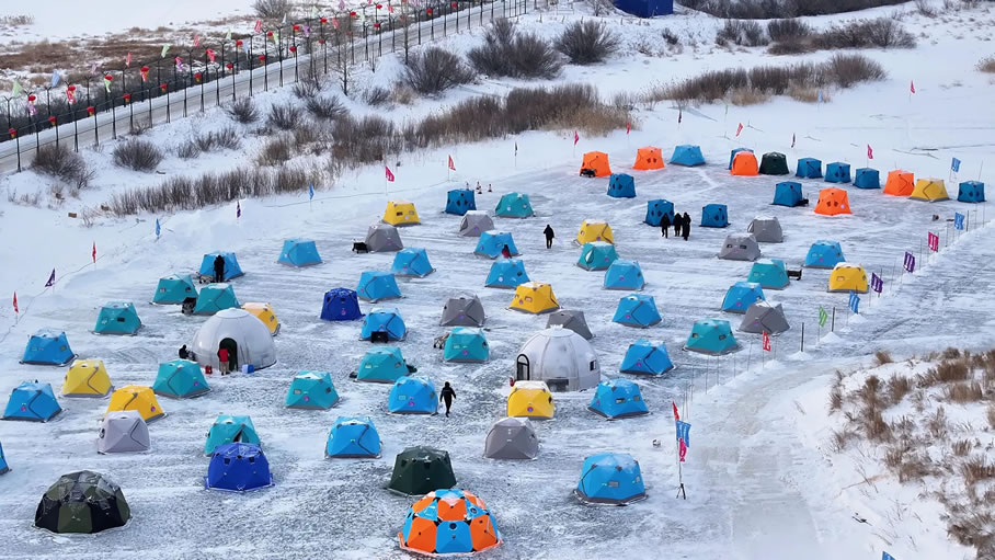 活動(dòng)融合冰釣體驗(yàn)、民俗展演與文化展示等,為游客打造了一場集運(yùn)動(dòng)、美食、互動(dòng)于一體的沉浸式冰雪文旅盛宴。作為核心項(xiàng)目,中俄界河冰釣與冰捕區(qū)備受矚目。界河之上,五顏六色的暖帳錯(cuò)落排布,冰釣愛好者早已按捺不住垂釣熱情,在帳篷內(nèi)生起暖爐、鑿開冰面、下好魚餌,支起小板凳,靜觀浮漂等候“佳音”。