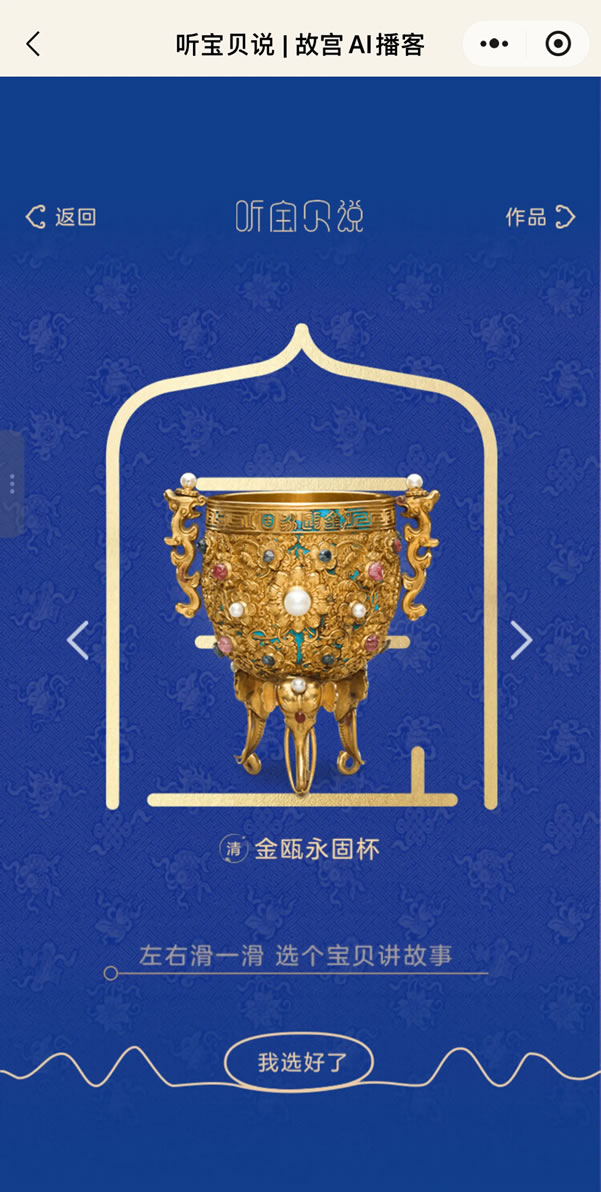在故宮博物院建院100周年的尾聲,“聽(tīng)寶貝說(shuō)”為家長(zhǎng)和孩子們呈上一份聲音禮物,通過(guò)個(gè)性化生成的AI播客,將文物故事轉(zhuǎn)化為視聽(tīng)語(yǔ)言。那些來(lái)自千百年前的珍貴文物,仿佛穿越時(shí)空,來(lái)到孩子身邊,開(kāi)始一場(chǎng)“寶貝”與“寶貝”間的聲音互動(dòng)。部分文物來(lái)自故宮博物院常設(shè)展館,聽(tīng)完還可以線下打卡,近距離欣賞文物“寶貝”。