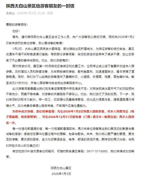 1月3日,陜西太白山景區(qū)發(fā)布給游客朋友的一封信稱,1月2日,太白山景區(qū)因突發(fā)大雪降溫,部分路段出現(xiàn)積雪結(jié)冰,為保證游客的絕對安全,景區(qū)交通車不得不采取穩(wěn)速慢行措施,導(dǎo)致部分游客滯留,對此深感愧疚。面對突發(fā)狀況,景區(qū)第一時間啟動應(yīng)急響應(yīng)和處置工作,立即停止線上線下售票并勸返未入園游客。截至當(dāng)日21時55分,所有入園游客均安全抵達(dá)游客服務(wù)中心。凡在2026年1月2日購票入園的游客,憑本人購票憑證(電子票截圖、紙質(zhì)票根等),可在2026年12月31日前免費(門票+景交車+索道往返)再次入園游覽一次。