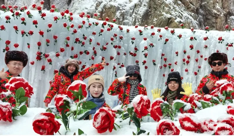 冰封的玫瑰、融入巖畫元素的雪雕、百米長(zhǎng)的雪圈滑道,將景區(qū)打造成夢(mèng)幻的冰雪秘境。身著多彩冬裝的游客們穿梭其間,或駐足觀賞或拍照打卡,不時(shí)發(fā)出陣陣贊嘆。“巖畫和冰雪結(jié)合,就像穿越到了冰河時(shí)代!”來(lái)自西安的游客李女士,一邊拍攝冰封玫瑰,一邊向同伴分享自己的感受。