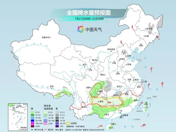 中國天氣網(wǎng)訊 今天(1月21日),南方雨雪繼續(xù)減少、減弱,但湖南、貴州等地部分地區(qū)仍有凍雨,需注意防范。明后天,中東部大部將進(jìn)入雨雪間歇期。隨著寒潮和雨雪影響結(jié)束,后天起長江以南地區(qū)氣溫將陸續(xù)轉(zhuǎn)為偏高,但北方多地氣溫仍然低迷,需注意保暖。