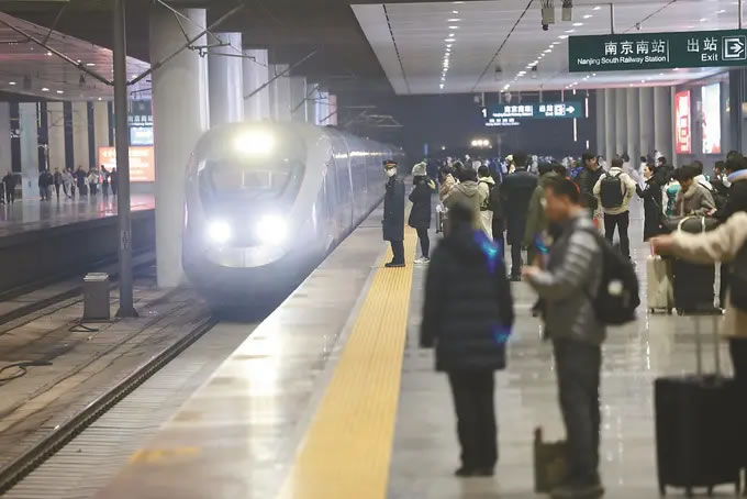 從1月26日零時起,全國鐵路實行新的列車運行圖,調(diào)圖后,圖定旅客列車較原圖增加243列。京滬高鐵標桿列車G25次迎來了“瘦身”升級:這趟京滬間最快高鐵取消原有5個?空,僅設南京南站唯一經(jīng)停點。圖為當日晚,旅客在南京南站準備乘坐G25次列車。(陳儼 攝)