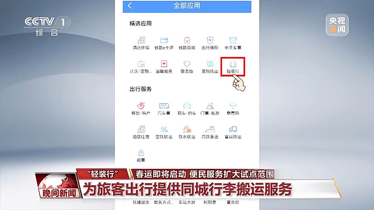 “輕裝行”是鐵路部門為旅客出行提供的“門到站”“站到門”同城行李搬運服務(wù)。已購車票的旅客只需打開鐵路12306App或微信小程序,在首頁中部應(yīng)用欄向左滑動,找到“全部應(yīng)用”,點擊進(jìn)入即可找到“輕裝行”模塊,根據(jù)需求預(yù)約下單。