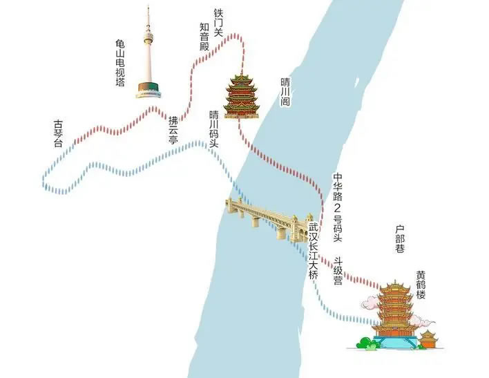 游線從蛇山黃鶴樓出發(fā),經(jīng)斗級(jí)營(yíng)歷史街區(qū)、戶(hù)部巷美食區(qū),再乘坐輪渡橫渡長(zhǎng)江,途中可觀賞長(zhǎng)江大橋及兩岸風(fēng)光,抵達(dá)漢陽(yáng)后游覽晴川燈會(huì),最終探訪龜山知音殿與古琴臺(tái)。線路雖短,卻集中展現(xiàn)武漢“半城山水半城詩(shī)”的城市意象。