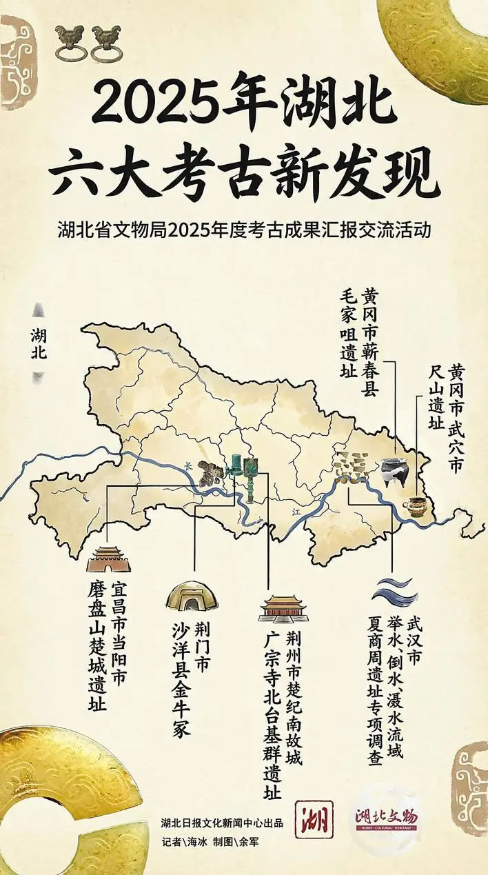 2月3日,在湖北省文物局舉辦的2025年度湖北省考古成果匯報交流活動上,正式公布了2025年湖北六大考古新發(fā)現(xiàn)。分別為:黃岡市武穴市尺山遺址、黃岡市蘄春縣毛家咀遺址、宜昌市當(dāng)陽市磨盤山楚城遺址、荊州市楚紀(jì)南故城廣宗寺北臺基群遺址、荊門市沙洋縣金牛冢及武漢市舉水、倒水、灄水流域夏商周遺址專項(xiàng)調(diào)查。
