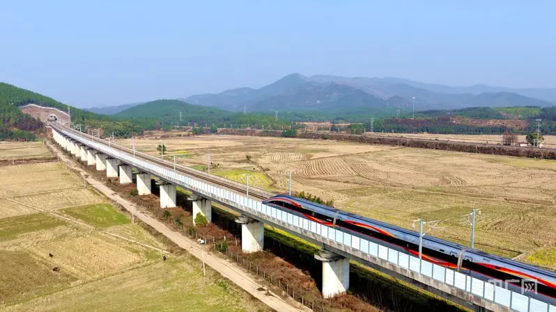 列車穿梭于田野山巒之間,構(gòu)成一幅生動(dòng)的高鐵春運(yùn)圖景 (央廣網(wǎng)發(fā) 宋靖輝 攝)