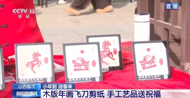 往前走就是各類手工藝品展臺(tái),木版年畫、石板拓印都能現(xiàn)場體驗(yàn)參與。一旁的剪紙藝人剪刀翻飛,紅紙?jiān)谥讣饬鬓D(zhuǎn)間,吉祥的福字與靈動(dòng)的生肖便躍然紙上。
