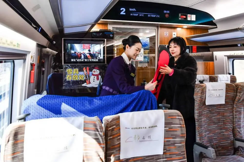 旅客可通過(guò)鐵路12306官方客戶端內(nèi)的“雪具便利行”功能,查詢服務(wù)車次、辦理預(yù)約并支付相關(guān)費(fèi)用后即完成辦理。辦理成功后,旅客可在乘車當(dāng)日將妥善包裝的雪具帶至車站,經(jīng)設(shè)有“雪具便利行”標(biāo)識(shí)的通道進(jìn)行安檢和驗(yàn)票,車站工作人員將同步核驗(yàn)車票與雪具運(yùn)送預(yù)約信息。上車后,旅客可在列車工作人員引導(dǎo)下,將雪具放置于鄰近的“雪具存放區(qū)”。列車運(yùn)行期間,工作人員將定時(shí)巡檢,共同保障雪具安全。