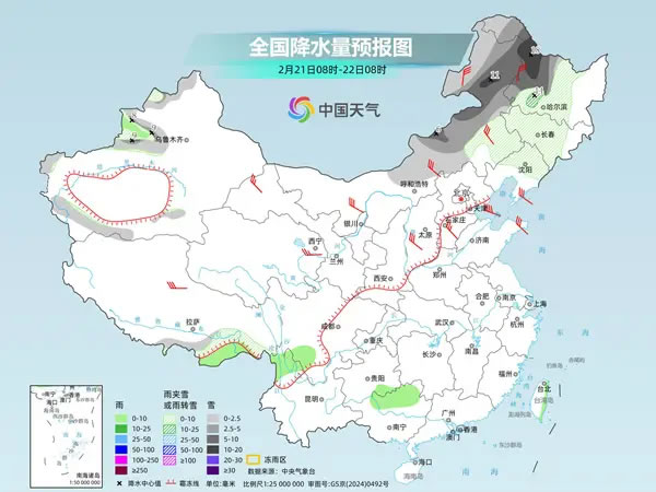 中央氣象臺預計,今天,內蒙古中東部、東北地區(qū)中西部、新疆伊犁河谷等地部分地區(qū)有小到中雪或雨夾雪,其中,內蒙古東北部和中部、黑龍江西部等地部分地區(qū)有大到暴雪。新疆伊犁河谷、西藏南部、四川南部、貴州東南部、云南西北部、廣西北部、臺灣島東部等地部分地區(qū)有小雨。