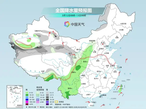 后天,內(nèi)蒙古東北部和中部、新疆沿天山地區(qū)和南疆山區(qū)、西藏西部和南部、甘肅大部、青海北部和東部等地部分地區(qū)有小到中雪或雨夾雪,其中,新疆東部和南疆山區(qū)等地部分地區(qū)有大到暴雪。新疆南疆盆地、西藏東南部、川西高原東部、陜西、四川盆地中西部、貴州西部、云南、臺灣島等地部分地區(qū)有小雨,局地有中雨。
