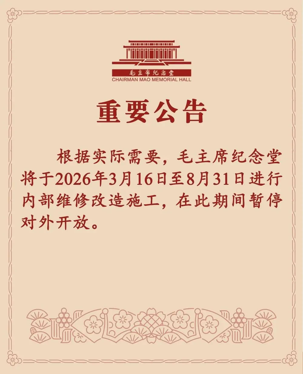 3月13日,毛主席紀(jì)念堂發(fā)布公告,3月16日至8月31日內(nèi)部維修改造施工,期間暫停對(duì)外開放。