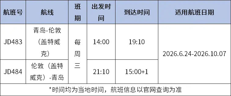 2026年夏秋航季重啟的青島往返倫敦(蓋特威克)航線,每周三固定執(zhí)飛,采用空客A330寬體機型,為英國旅客進入中國華東地區(qū)搭建直達橋梁。借助青島航空樞紐的輻射作用,該航線可聯(lián)動國內多地航線,實現(xiàn)英國旅客來華后的無縫銜接。具體航班時刻如下(均為當地時間,航班信息以官網查詢?yōu)闇剩?/p>
