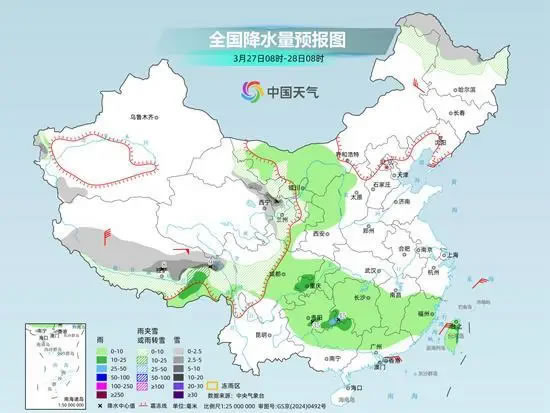 未來三天,南方仍有較大范圍陰雨天氣,西南地區(qū)東部、江南、華南北部等地有中到大雨,貴州中南部、湖南中部、江西中部、福建北部等地局地有暴雨,上述地區(qū)局地伴有短時強(qiáng)降水或風(fēng)雹天氣。此外,青藏高原東部多雨雪天氣,新疆沿天山高海拔山區(qū)有中到大雪,局地有暴雪或大暴雪。