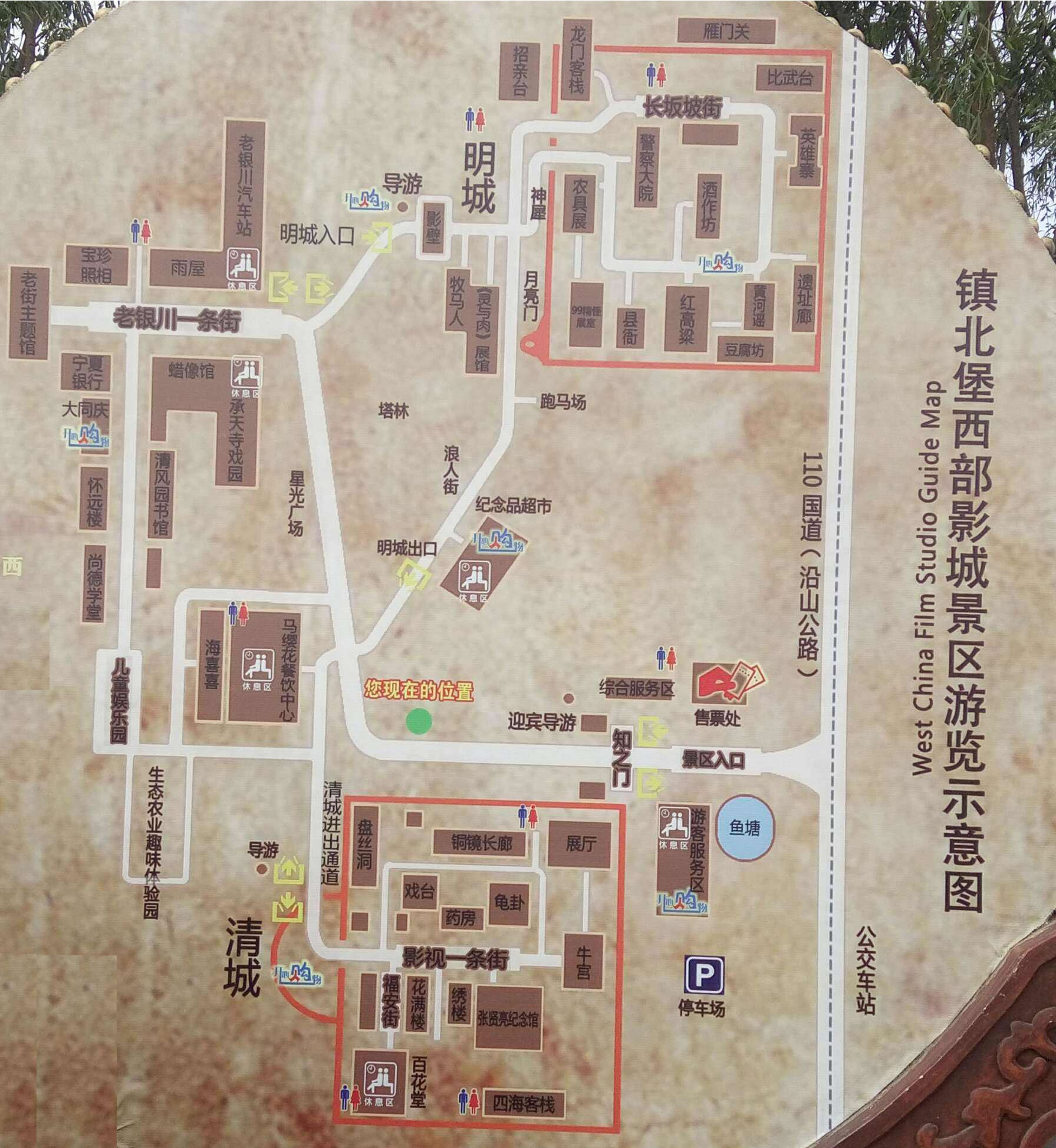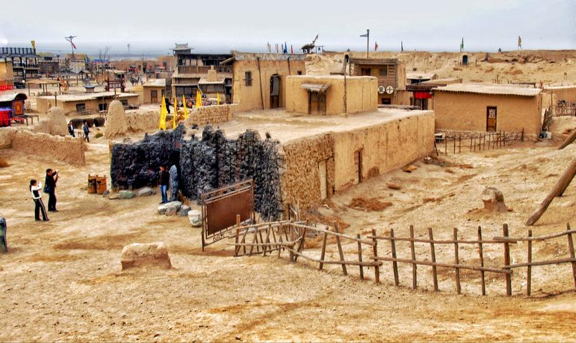 鎮(zhèn)北堡西部影城,位于寧夏回族自治區(qū)銀川市西夏區(qū)北端,占地面積0.7平方公里,建筑面積50萬(wàn)平方米。鎮(zhèn)北堡西部影城有兩座古代城堡,兩堡一南一北,名為鎮(zhèn)北堡和鎮(zhèn)南堡,均坐西朝東。鎮(zhèn)北堡西部影城以古樸原始粗獷荒涼民間化為特色。鎮(zhèn)北堡西部影城內(nèi),保留和復(fù)原了拍攝過(guò)部分影片的場(chǎng)景和道具,供游人觀賞。展出的場(chǎng)景有《大話西游》中的城門樓和城門洞盤絲洞,孫悟空與牛魔王打斗時(shí)的“天崩地裂”等一系列場(chǎng)景!饵S河謠》中的“鐵匠營(yíng)”實(shí)景。《紅高粱》中的月亮門、釀酒作坊、九兒(鞏俐飾)居室和九兒出嫁時(shí)乘坐的轎子、盛酒的大缸碗具等。還建有電影資料館放映廳等影視服務(wù)設(shè)施。