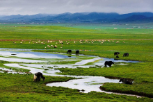 祁連山草原因交融之美,被評(píng)為“中國最美的六大草原”之一,具有面積大、草質(zhì)好、類型多、產(chǎn)草量高等特點(diǎn),有罕見的林中草場。海拔4000以上還有高山積雪形成的碩長而寬闊的冰川地貌奇麗壯觀。進(jìn)入祁連境內(nèi),放眼望去,滿目盡是草原旖旎的風(fēng)光。夏季的草原像是廣袤無垠的綠毯,滿山的白藏羊恰似散落的珍珠,黑色的牛毛帳篷、裊裊升起的炊煙、牧人悠揚(yáng)的歌聲,這一幕如畫風(fēng)景卻是草原最尋常的景色。