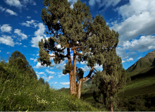 祁連圓柏為常綠喬木。是青藏高原氣候驟變時(shí)期產(chǎn)生的樹種,是名副其實(shí)的常青樹。其葉在幼樹上全為刺形,隨著樹齡的增長刺形葉逐漸被鱗形葉代替,廣泛分布于海拔2600 -4300米的陽坡、半陽坡地帶,耐寒旱、耐貧瘠,對(duì)土壤要求不高,能生于酸性、中性及石灰質(zhì)土壤上,其枝葉會(huì)散發(fā)出獨(dú)特的清香,具有清神醒腦的功效。因其根系發(fā)達(dá),有良好的保水固土和涵養(yǎng)水源的作用,固為祁連地區(qū)主要的造林樹種和草原牧護(hù)林。以葉入藥,性苦,有止血、鎮(zhèn)咳功效。