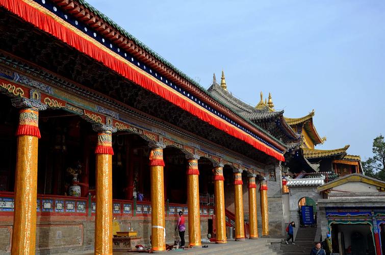 又稱文殊菩薩殿,為漢式硬山頂建筑,面闊九間,進(jìn)深三間,面積592平方米。初建于明萬歷二十年(公元1592年),清雍正十二年(公元1734年)擴(kuò)建。廊柱為藏式朱色八楞柱。整座大殿以三間為一單元,由北向南分別為獅子吼佛殿、文殊殿和宗喀巴殿;ㄋ掠址Q祈壽殿,建于清康熙五十六年(公元1717年),系一獨(dú)立的小庭院,殿為兩層重檐歇山頂建筑。柱頭梁枋都飾以飛禽、走獸、花卉、文紋,院墻飾琉璃磚雕。殿內(nèi)供奉釋迦牟尼、十六羅漢和四大金剛等塑像。