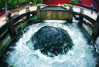 為濟(jì)南七十二名泉之一。位于百脈泉公園龍泉寺西南側(cè),泉池呈方形,漢白玉雕砌,正常年流量0.3立米/秒。泉孔黝深,水色蒼蒼如墨而得名。泉眼直徑0.4米,泉水騰涌而出,水清透明,泉水黝深,故名“墨泉”。墨泉水出自深部奧陶紀(jì)石灰?guī)r巖溶裂隙,盛水期泉流量0.5立方/秒,水柱沖出泉口,聲如雷鳴,雪濤飛濺。注入石渠,浩浩而下,有“一泉成河”的美譽(yù)。泉池前后刻“墨泉”二字,為大書法家舒同先生題寫。字體方正渾厚,“頗具魏晉飄逸之氣,含篆籀之義理,得分隸之謹(jǐn)嚴(yán)”,墨泉所在位置1966年-1980年曾是章丘縣委家屬住院,時(shí)任章丘縣委書記的舒同先生居此。