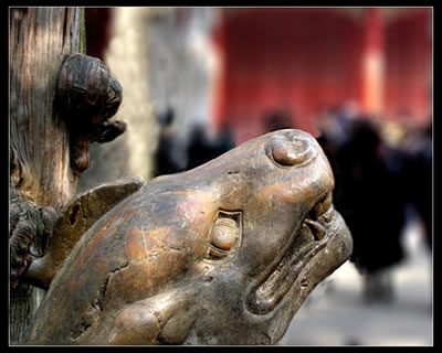 洙水橋北,先是一座綠瓦三楹的高臺大門——擋墓門,后面就到了供奉孔子木主的享殿。去享殿的甬道旁,有四對石雕,名曰華表、文豹、角端、翁仲。華表系墓前的石柱,又稱望柱;文豹,形象似豹,腋下噴火,溫順善良,用以守墓;角端,也是一種想象的怪獸,傳說日行1萬8千里,通四方語言,明外方幽遠(yuǎn)之事;翁仲,石人像,傳為秦代驍將,威震邊塞,后為對稱,雕文、武兩像,均稱翁仲,用以守墓。兩對石獸為宋宣和年間所刻,翁仲是清雍正年間刻制的,文者執(zhí)笏,武者按劍。甬道正面是享殿,殿廣5間,黃瓦 歇山頂,前后廊式木架,檐下用重昂五踩斗栱。殿內(nèi)現(xiàn)存清帝弘歷手書“謁孔林酹酒碑”,中有“教澤垂千古,泰山終未頹”等詩句。解放戰(zhàn)爭時,朱德總司令曾在此殿內(nèi)召開過軍事會議。