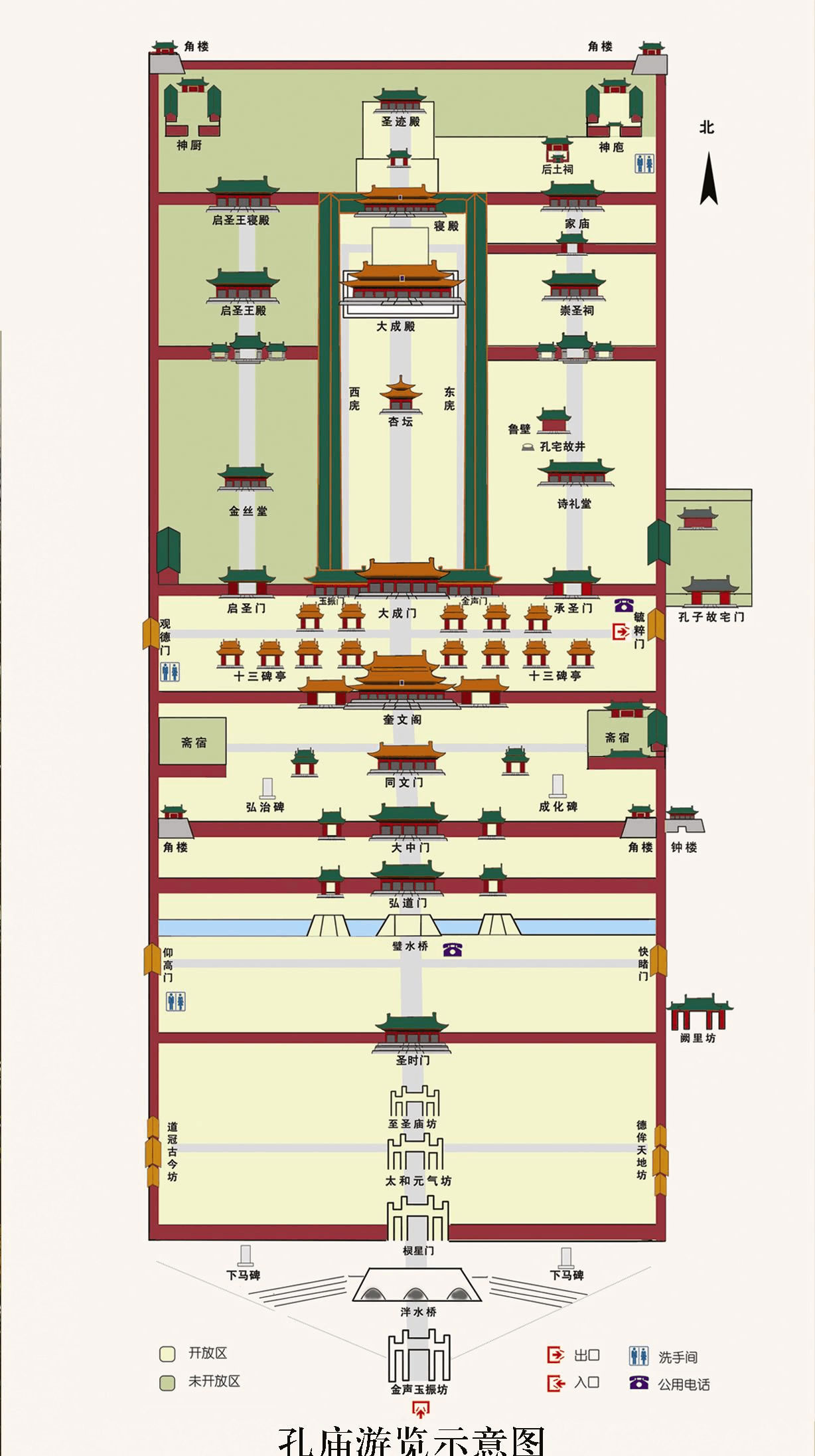橋南東西二門(mén),甬道相連,東匾“快睹門(mén)”,取李渤“如景星鳳凰,爭(zhēng)先睹之”語(yǔ),即“先睹為快”之意;西匾“仰高門(mén)”取自《論語(yǔ)》“仰之彌高”語(yǔ),贊頌孔子學(xué)問(wèn)十分高深。此是孔廟的第二道偏門(mén)。過(guò)去只有皇帝祭祀才可走正門(mén),一般人只駔從仰高門(mén)進(jìn)廟。