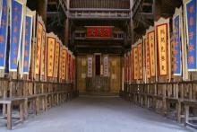 忠義堂院落里,中央是一根朱紅色的旗桿,上面懸掛著一面杏黃旗,-“替天行道”四個(gè)黑色大字。忠義堂前的平臺(tái)兩側(cè),又有兩桿粉色的大旗,東面的旗幟上是“山東呼保義”,西邊懸掛的是“河北玉麒麟”。