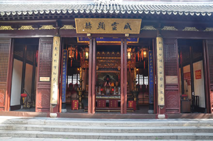 上海城隍廟,位于上海市黃浦區(qū)方浜中路249號,坐北朝向南,內(nèi)部有大門、二門、戲樓、大殿、寢宮、東西廊廡,沿中軸線依次排列,總面積約三千余平方米。廟內(nèi)主體建筑有大殿、元辰殿、父母殿、關(guān)圣殿、文昌殿等9個殿堂,總面積約三千余平方米。大殿、中殿改為鋼筋混凝土結(jié)構(gòu)。大殿高16米,寬13.7米,進深21米。歇山頂,彩椽畫棟,翠瓦朱檐,華麗輝煌。大殿前有照壁、牌坊、戲臺、碑亭。大殿祀霍光,中殿祀秦裕伯,兩側(cè)花廳奉城隍父母,后殿奉城隍夫人,樓上為寢宮。