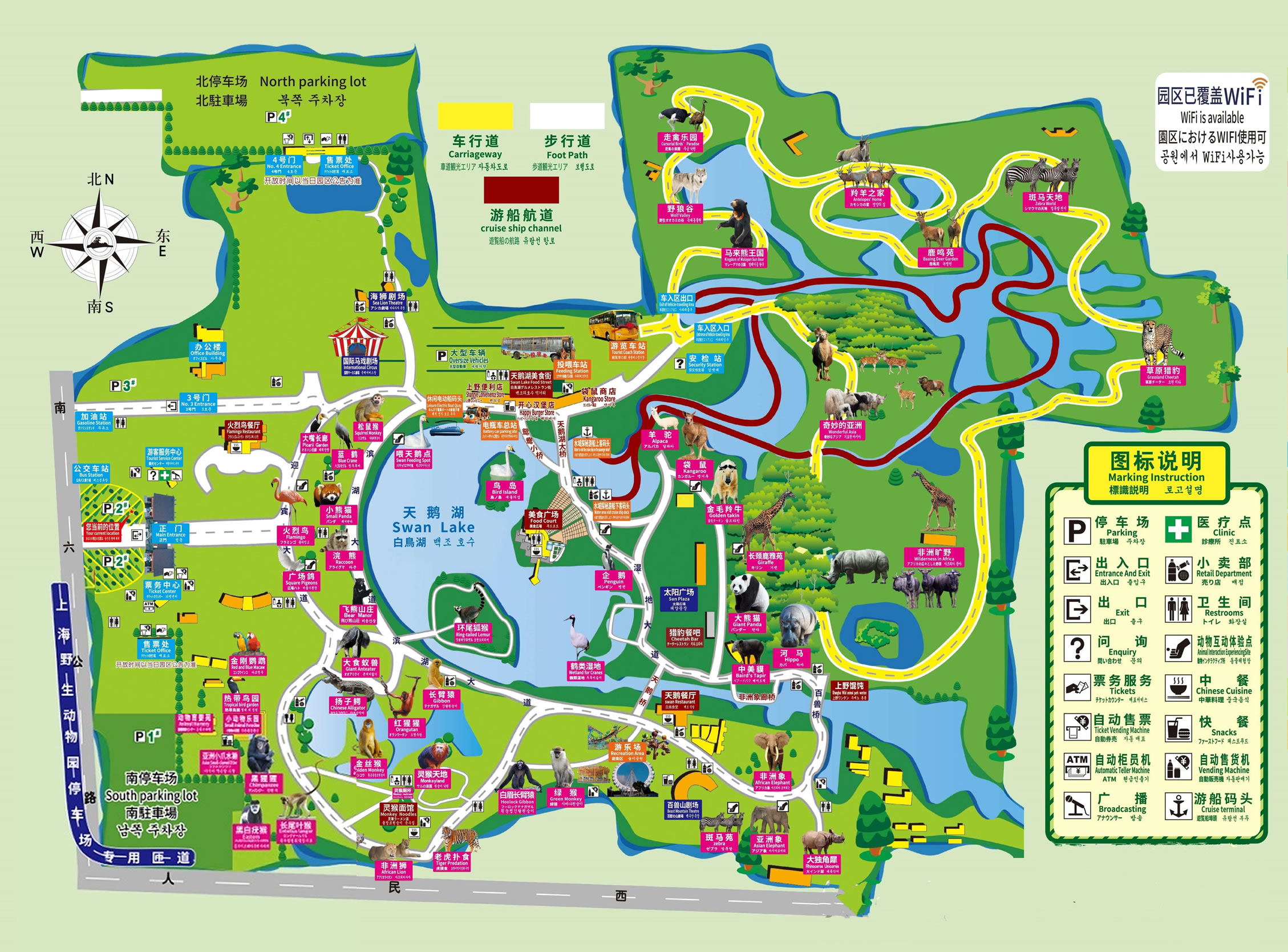 上海野生動(dòng)物園現(xiàn)有車入?yún)^(qū)、步行區(qū)兩大區(qū)域。車入?yún)^(qū)分布著奇妙的亞洲、非洲曠野、優(yōu)雅長(zhǎng)頸鹿、最美閃電俠、草原霸主、荒野大力熊、森林之王、白虎領(lǐng)地、野狼谷、馬來(lái)熊王國(guó)10大主題區(qū)域。步行區(qū)則分布著大熊貓館、鶴類濕地、火烈鳥(niǎo)展區(qū)、企鵝館、天鵝湖、羊駝苑、紅猩猩館、中美貘館、小動(dòng)物樂(lè)園、鸚鵡館、河馬館、白眉長(zhǎng)臂猿展區(qū)、大食蟻獸展區(qū)、鱷魚(yú)島、狐猴島、浣熊展區(qū)、金絲猴島、飛熊山莊、綠猴區(qū)、白虎展區(qū)、松鼠猴、小熊貓區(qū)、黑猩猩館、袋鼠坡、長(zhǎng)頸鹿雅苑、亞洲象展區(qū)、金毛羚牛館、國(guó)禮非洲獅展區(qū)、熱帶鳥(niǎo)園、斑馬苑、非洲象展區(qū)、老虎撲食區(qū)、白頰長(zhǎng)臂猿島、藍(lán)鶴、大獨(dú)角犀、大嘴長(zhǎng)廊、靈猴天地、亞洲小爪水獺展區(qū)、太陽(yáng)廣場(chǎng)共39個(gè)館區(qū)。