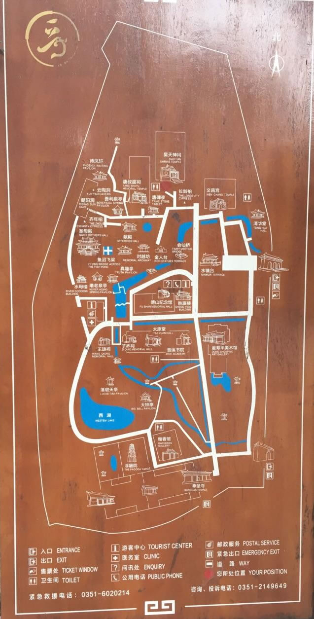 北部從文昌宮起,有東岳祠、關(guān)帝廟、三清祠、唐叔祠、朝陽洞、待風(fēng)軒、三臺閣、讀書臺和呂祖閣。這一組建筑物大部隨地勢自然錯綜排列,以崇摟高閣取勝。南部從勝瀛樓起,有白鶴亭、三圣祠、真趣亭、難老泉亭、水母樓和公輸子祠。這一組樓臺計峙,泉流潺繞,頗具江南園林風(fēng)韻。